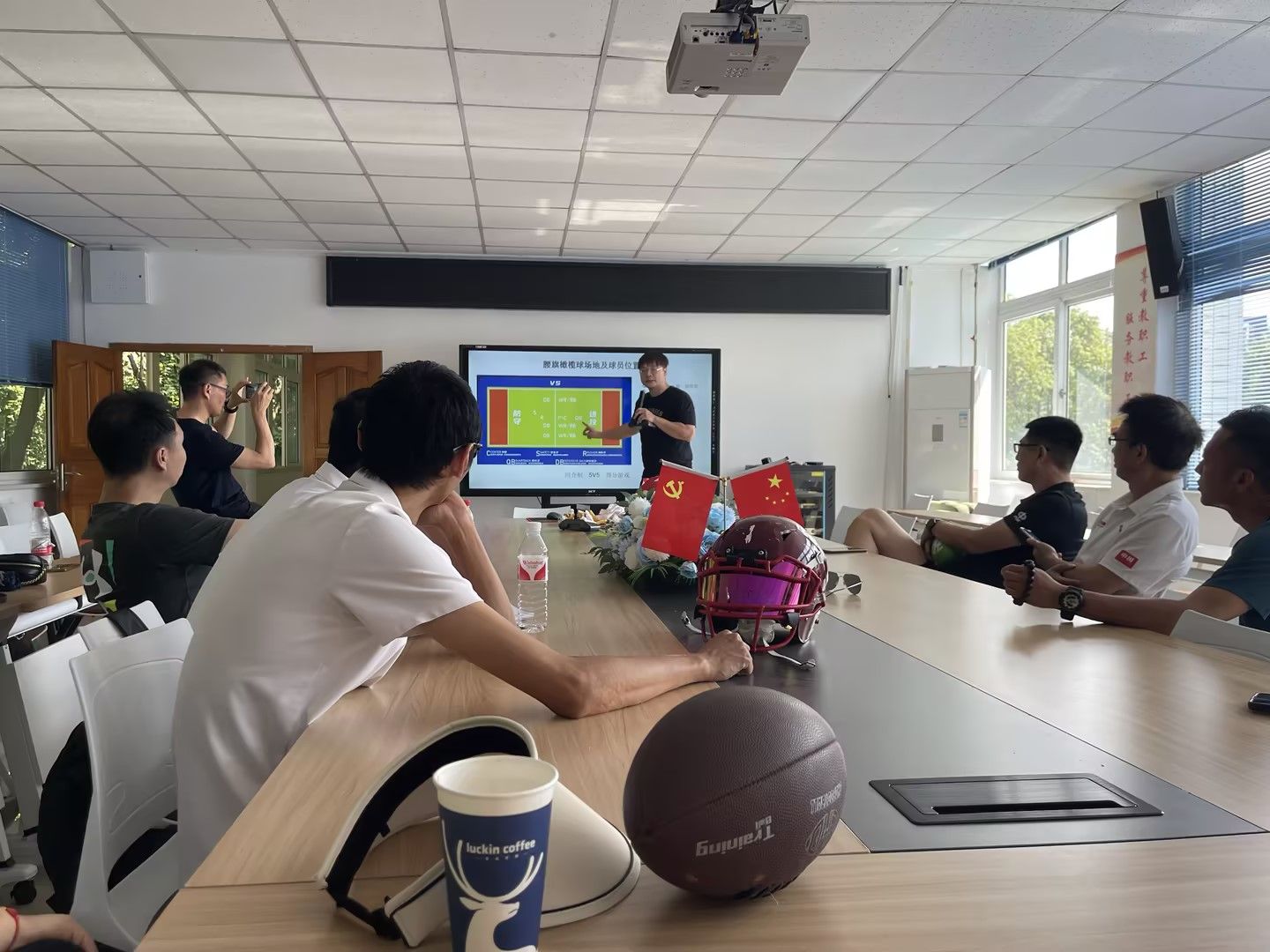 在教研活动的理论学习环节,夏育佳首先向老师们详细介绍了橄榄球的历史。他提到,橄榄球起源于19世纪的英国,经过数百年的发展,已经成为一项全球性的体育运动。随后,夏育佳详细讲解了橄榄球的分类,包括美式橄榄球、英式橄榄球和澳式橄榄球等,以及它们各自的比赛规则和特点。